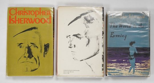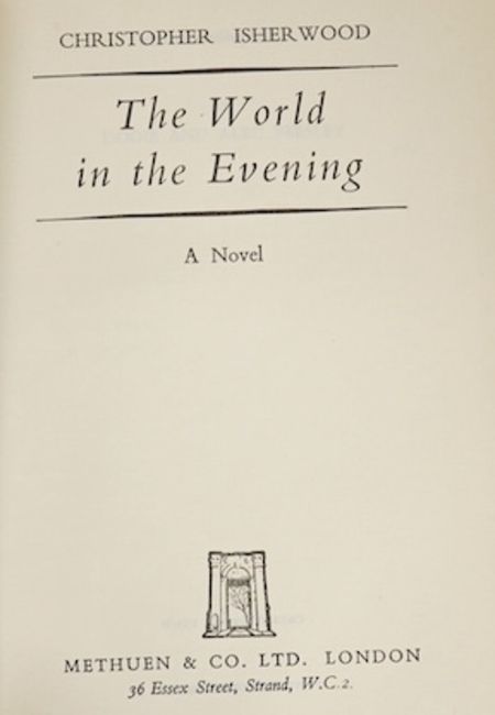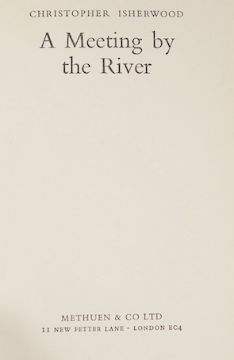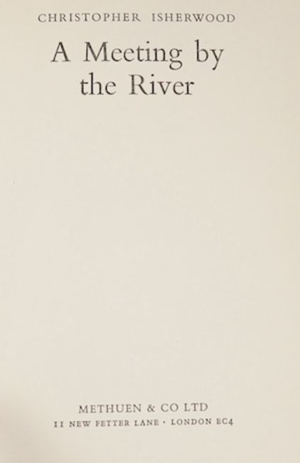 ° Isherwood, Christopher. The World In The Evening, Methuen and Co Ltd, 1954; A Single Man. Methuen and Co Ltd, 1964, 8vo, original cloth cover, with dust jacket. Dust jacket has publisher's clip across bottom of front flap and printed, "Price 16s net in U.K. only."; A Meeting by the River, Methuen and Co Ltd, 1967, all first edition (3)