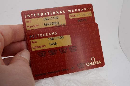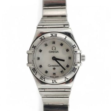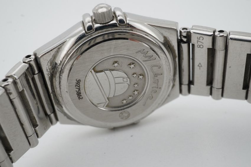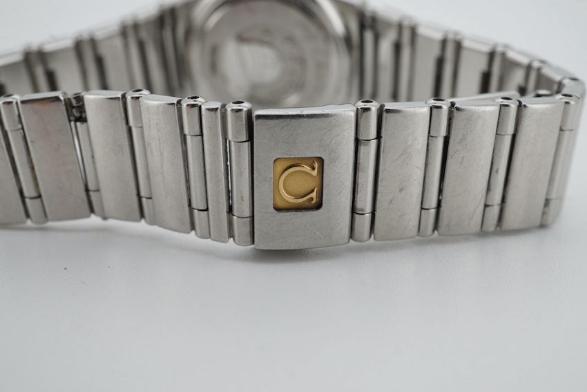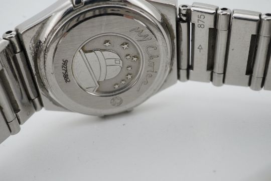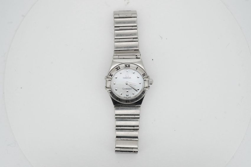 A lady's 2006 stainless steel Omega Constellation quartz wrist watch, with mother of pearl dial, ref. 15617100, c.1456, case diameter 23mm, with Omega pouch, spare links and guarantee cards. Condition - fair