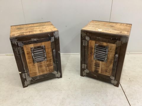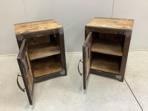 A pair of industrial style metal mounted meat safe cabinets, width 45cm, depth 39cm, height 61cm. Condition - fair