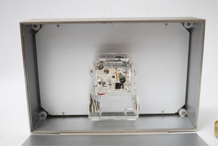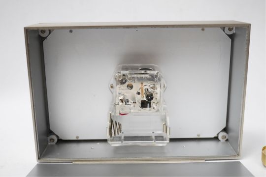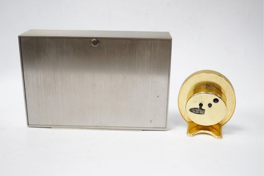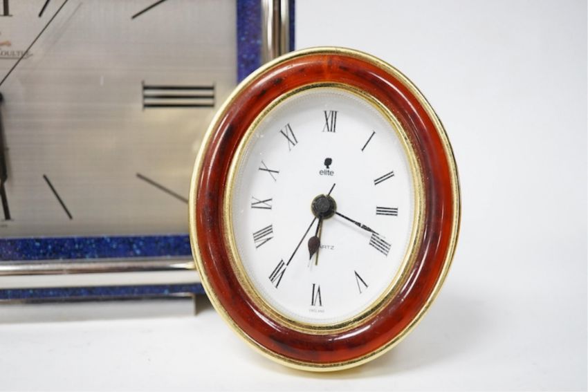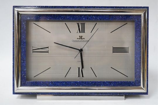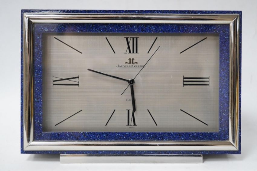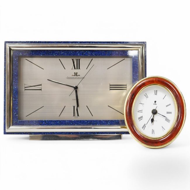 A Jaeger LeCoultre electric Swiss timepiece with chrome and Lapis style front and another smaller quartz timepiece, 20cm x 14cm. Condition - case good, unchecked it working