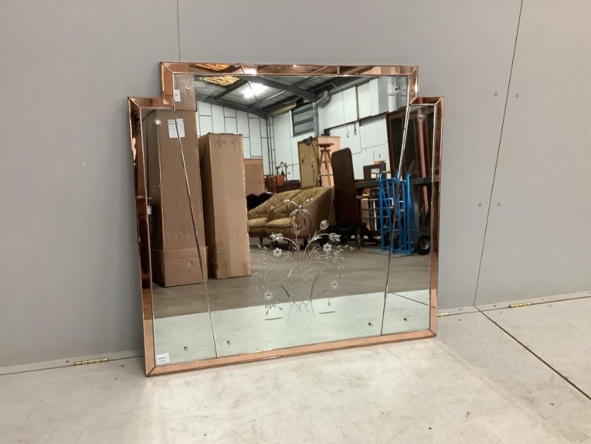 An Art Deco style engraved, peach and clear glass overmantel mirror, width 108cm, height 101cm. Condition - fair