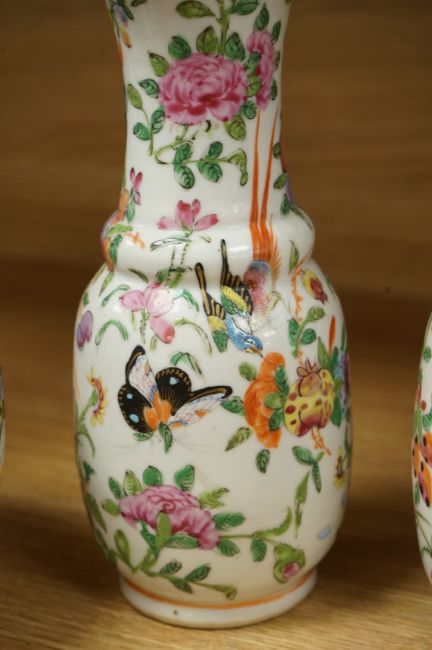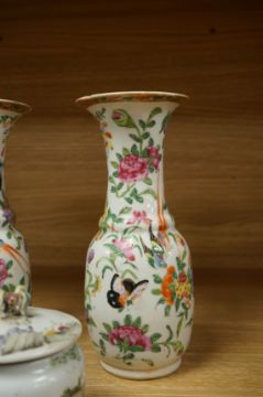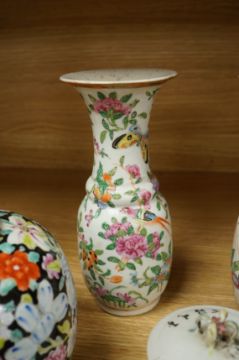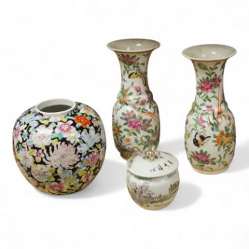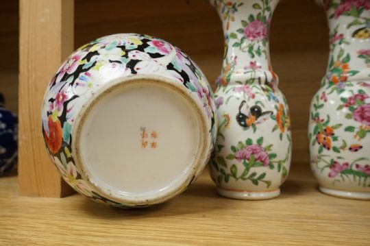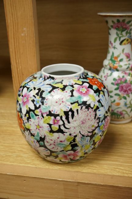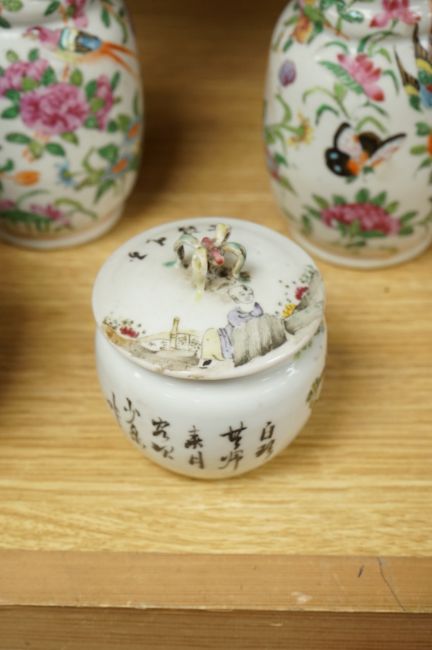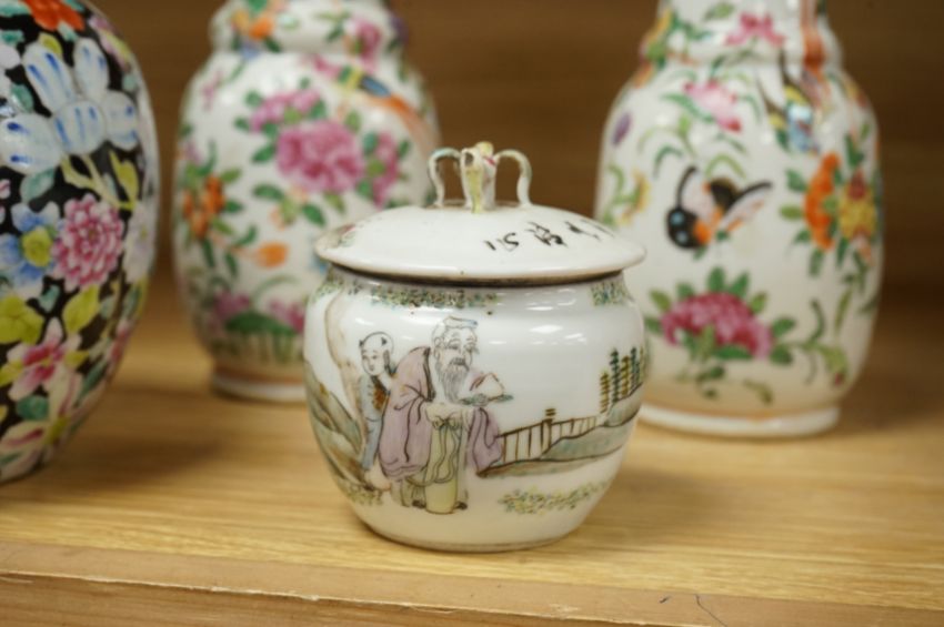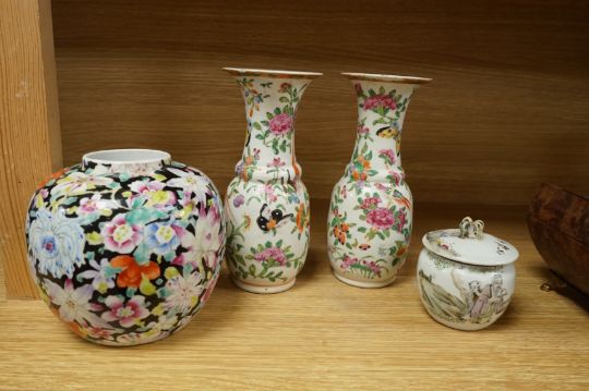 A Chinese 'Thousand Flower' jar, two famille rose vases, and a Republic period jar and cover, largest 19cm high