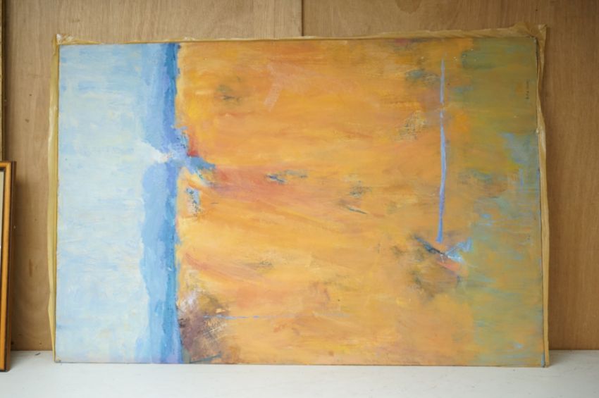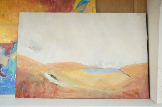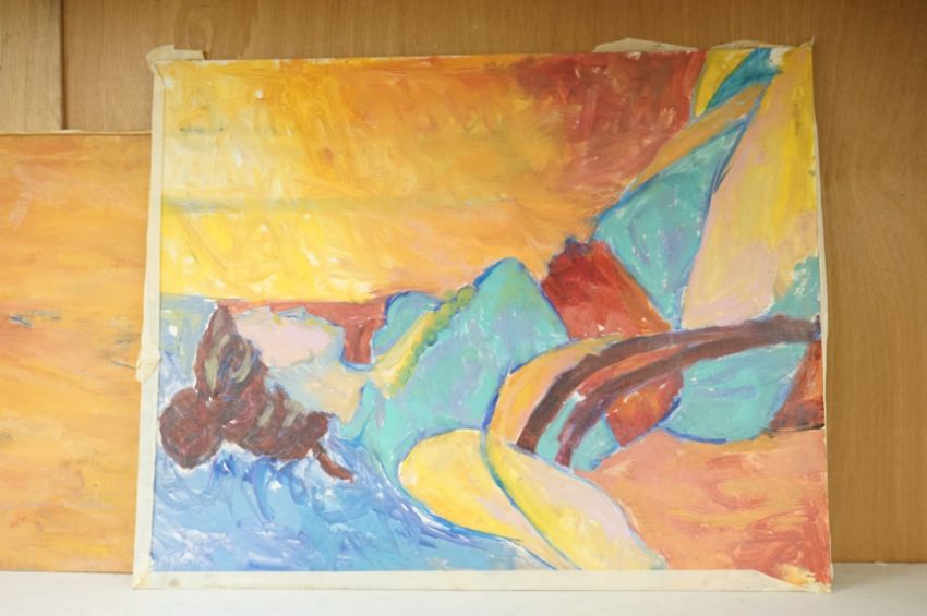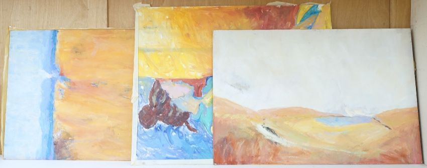 Billie Newey (Contemporary), three abstracts, one titled ‘Red Dawn’, with another oil to the reverse of the board and a portrait of a lady, each signed, oils on board, largest 76 x 61cm, unframed Provenance: The Tanyards Collection, East Sussex