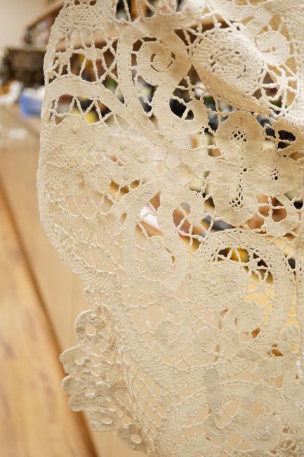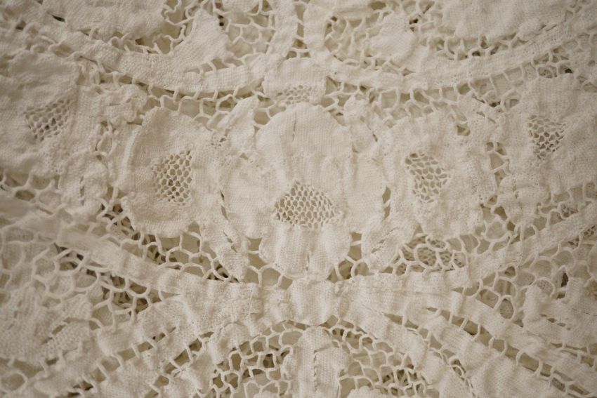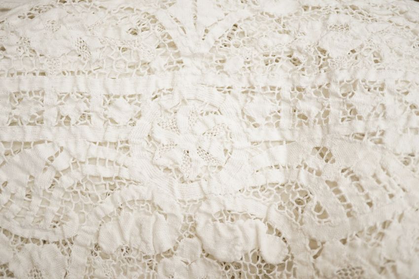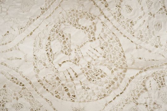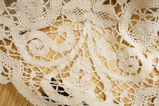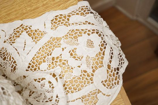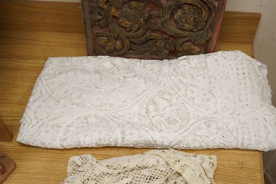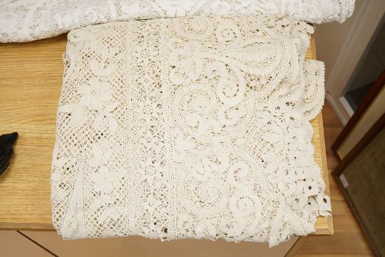Two ornately designed tape lace bed covers, white cover 152cm x 236cm, beige cover 176cm x 364cm