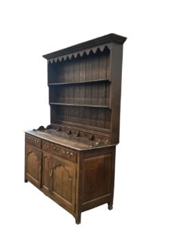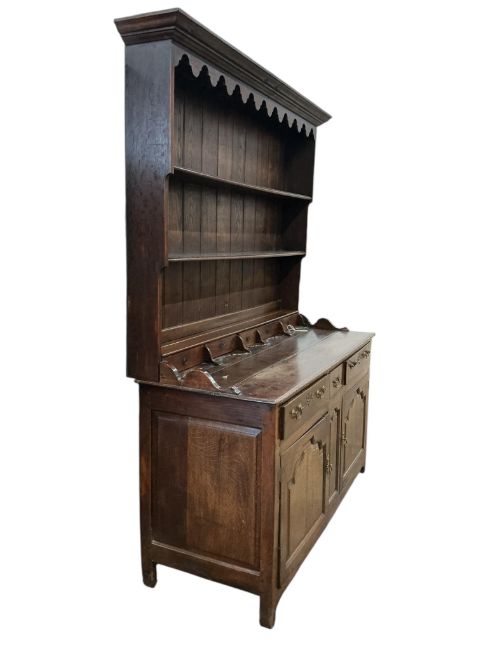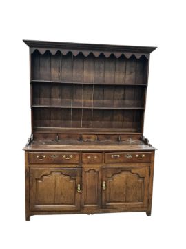 An 18th century oak dresser with boarded rack, width 160cm, depth 60cm, height 215cm