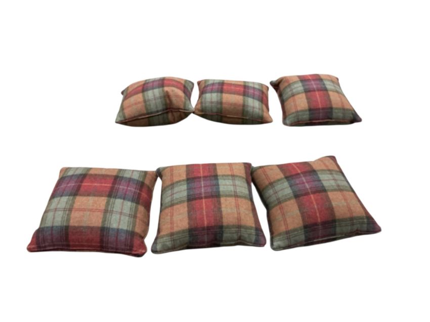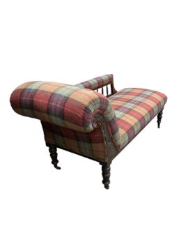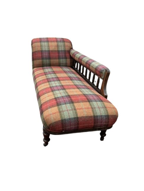 A Victorian mahogany daybed upholstered in tartan wool fabric with six matching cushions, width 180cm, depth 60cm, height 75cm